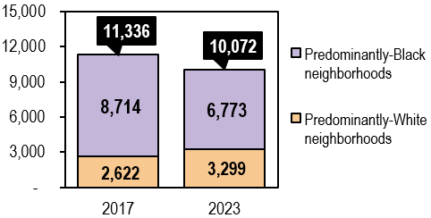 Complaints of illegal duming submitted to Citizen’s service Bureau declined from 11,336 in 2017 to 10,072 in 2023. Despite this modest decrease, the overwhelming majority of complaints still come from majority-Black neighborhoods.